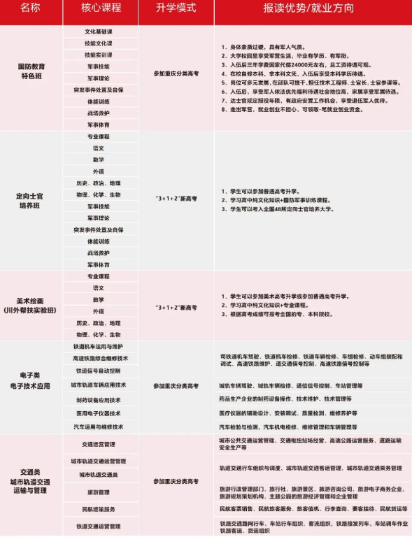 学校位于重庆主城宜居两江新区,交通便利,高速地铁环抱,机场商圈毗邻,占地88亩,校园环境优美,绿树成荫,花香四溢,现代化的教室和舒适的学生公寓为学子提供了良好的学习和生活条件:学校拥有标准化运动场、各类专业实训室以及大型军事拓展训练基地,致力于培养全面发展的优秀人才。