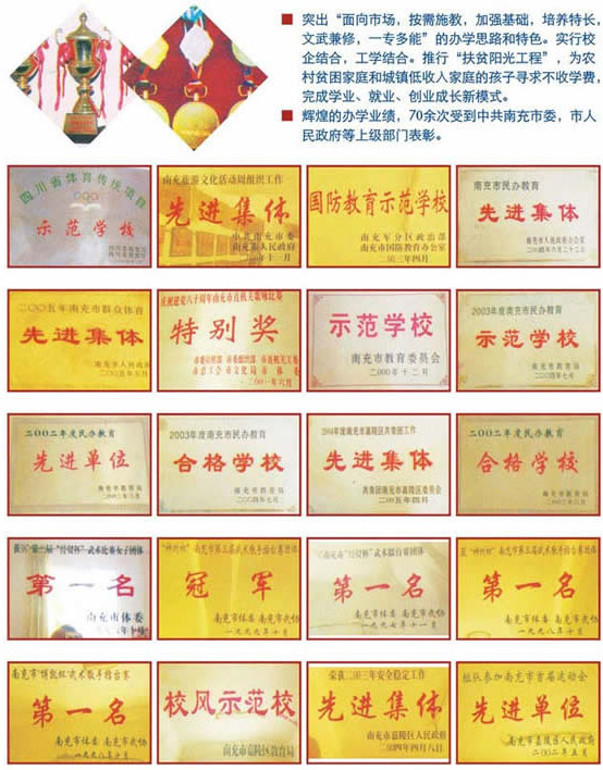 四川慧明中等专业学校是经四川省教育厅批准成立的一所具有独立颁发中专文凭资格的中等专业学校(川教成[1995]84号和川教函[2003]187号)。学校由四川省组织人事研究会创办.学校的办学宗旨是:创办一所高质量、有特色、有品位的现代职业学校。为了实现培养“有世界眼光、有中国特色、有社会责任感、有真才实学、有创造精神和开拓精神的现代人”的宏伟目标,十几年来,学校秉承“求真务实、和谐合作、开拓创新、追求卓越”的精神,为了办政府最需要的教育,办社会和人民最满意的教育,学校实行“人本管理,法制管理,系统管理,严格考核,奖功罚过,不拘一格,育才用才”的原则,以一流的师资,一流的管理,一流的设施,一流的质量,努力突出特色意识,质量意识,合作意识,现代意识,发展意识,真正体现学生有特长,班级有特点,学校有特色,让每个学生在这里得到充分的赏识与浓厚的关爱,让每个学生在开发、平等、和谐、温馨的氛围中学会做人,学会学习,学会生活,学会创造,让每个学生在这里学会适应社会生存,适应未来发展要求。 四川慧明中等专业学校坐落在风景秀丽的南充市玉屏公园脚下,陈寿万卷楼旁。现有在校学生3000多人。校区投资4000余万元,修建了可供3000多学生学习和生活用的教学楼、综合楼、公寓、食堂以及活动、实验实习场地。教学设施齐全,设备先进,每间教室都有空调、彩电,每间教室都有多媒体教学器材。学校有计算机500多台,缝纫机50台,有电子实验室,阶梯教室,语音室,图书室,有金工实习实验基地,有供学生实验操作的汽油、柴油车及发动机10余台,有供模具、数控、机械制造等专业实验操作用的数控车床、线切割、火花机、钻孔机、各式车床、铣床、刨床、磨床、台钻、摇背钻床、电焊机、钻孔机、钳工台、切割机等各种设备40多台。在这里,学生能熟练地掌握本工种的各种技能,达到本工种的中极技术水平,并能掌握各种车床、机床的维修保养,凡来我校读书的学生,他们都能学会驾驶。 四川慧明中等专业学校自创办以来,始终坚持“文无兼修,一专多能”的办学特色,实施“模块式教学、技能大练兵”教学新模式,学校根据社会需要,开设了计算机、航空服务、铁路服务、工业与民用建筑、幼儿教育、网络技术、财会、数控、模具制造、机械制造、经警、特警技能、电子技术、旅游管理、酒店管理、服装设计与制作、广告设计与制作、动漫制作、机械制造、汽车制造与维修、工商管理、市场营销等20多个专业。
